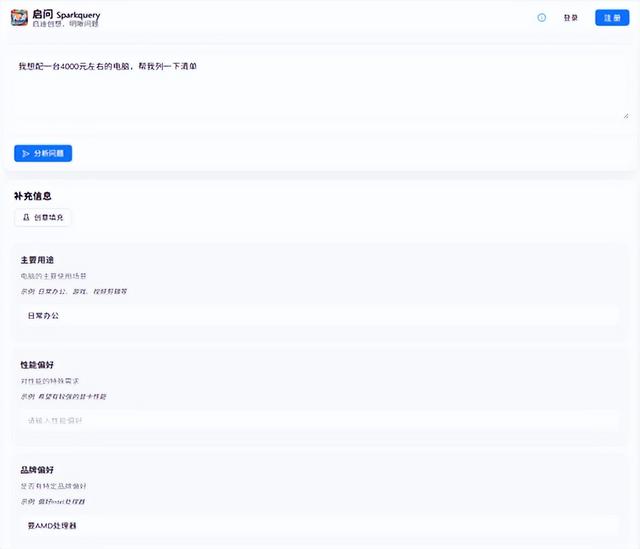 通过“启问Spark Query”的引导,用户输入了主要用途、外设需求、品牌偏好和预算限制等信息。比如主要用于日常办公,需要一台27英寸显示器,处理器要求使用AMD。