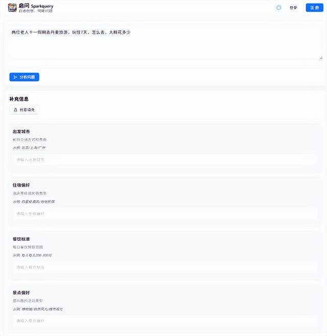 通过“启问Spark Query”,用户被引导输入出发城市、住宿偏好、餐饮标准、景点偏好和交通偏好等信息。